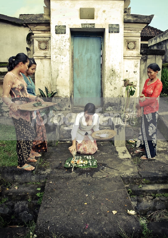 para wanita pendudu desa tengkulak, ubud-bali sedang menyiapkan sesaji, menyamput hari raya nyepi.