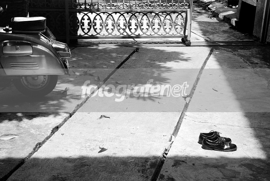 bagian gelap terangnya ikut membentuk foto ini. wah bagasi vespanya terbuka tuuh. kenapa sepatunya dijemur ya???