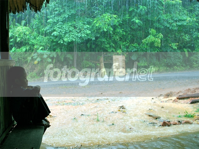 Om. Wah ini khas hujan di kalimantan kali ya? Lebat minta ampyun kaya air terjun. Butir hujan besar2 nan rapat, alias, curah hujan tinggi. Obyek foto kalimantan banget : rimbunan pohon, hujan deras, tanah muda, plus jalan tanpa selokan (masalah infrastruktur). saya bisa merasakan tantangan pas memotret, bulir2 air mungkin menyerang kamera. IMHO masih ada untungnya tanpa flash, bocah jadi terlihat sbg siluet. Sip.