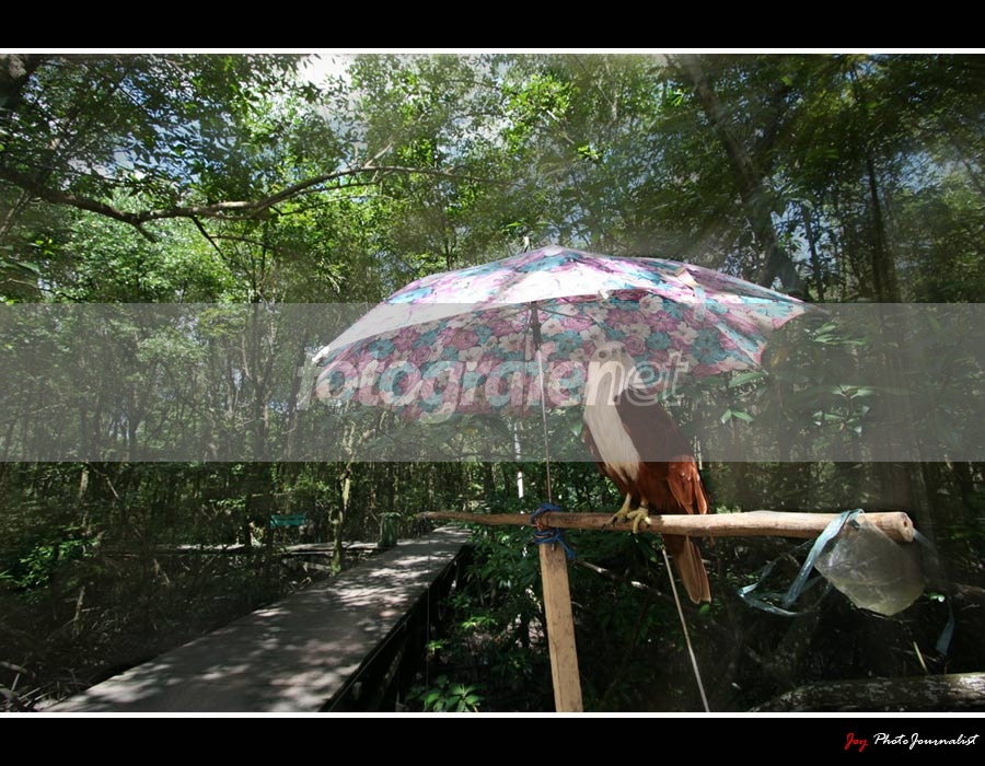Masuk ke lokasi wisata Kawasan Konservasi Mangrove Bekantan, eh malah ketemu Elang Laut Steller (Haliaeetus Pelagicus) yang merupakan burung besar pada famili Accipitridae. Lucu aja, burung udah nggak dikandangin, malah dipayungi.nnMohon tinggalkan jejak ya... Thanks