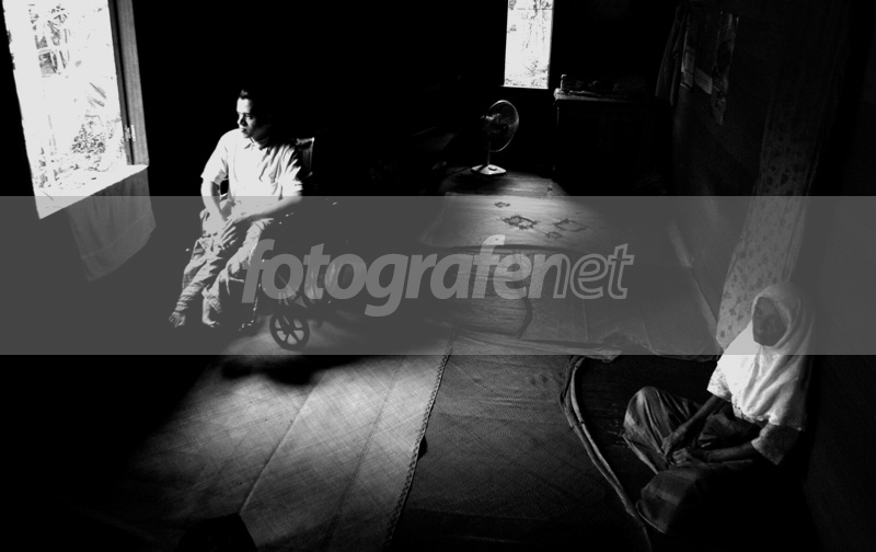 Muhammad Amin, (30, Lambaro- Aceh Besar)nnMik begitu ia biasa dipanggil, adalah seorang penjual pulsa. Ia berjualan pulsa di rumah dan juga kadang-kadang dibawa berkeliling kampung dengan sepeda modifikasi roda tiga yang ia buat sendiri. Mik lahir dengan kondisi kedua kaki mengecil akibat virus Polio, sehingga harus berjalan merangkak, kondisi ini membuat ia tidak menyelesaikan pendidikan SD-nya. Mik tinggal berdua dengan ibunya di rumah tradisional Aceh, tetapi kondisi ini tidak membuat dirinya harus mengurung diri di atas rumah panggungnya. Mik yang murah senyum ini sanggup beraktifitas dengan sigap dan bekerja membantu Ibunya. Selain berjualan pulsa, ia juga adalah seorang pembuat jaring penangkap ikan dari listrik, dan pelanggannyapun datang mulai dari Banda Aceh, Aceh Besar dan Meulaboh. nn“Semua manusia diciptakan sejajar, hanya manusia sendirilah yang meletakkan dirinya di jajaran yang lebih tinggi†David Allan CoennMik, as people use to call him, is a phone voucher seller. He runs his business from home and sometimes he rides his three-wheeled-self-modified bike around his village. He was born with Polio virus, so his legs could not grow like others. He has to crawl, and this has stopped him from finishing elementary school. Mik lives with his mother in Acehnese traditional house. Because of his condition, he sometimes cannot afford going out of two-storey wooden house. Day to day activities keep him busy. Not only helping his mother and selling phone voucher, he is also busy making electrify fishing net. Still, he has to welcome all the customers coming mostly from Aceh Besar, Banda Aceh and Meulaboh. nn“All men are created equal; but only men place themselves above equality,†David Allan CoennDate Time Original: 2009:08:14 04:45:11nISO Speed Ratings: 400