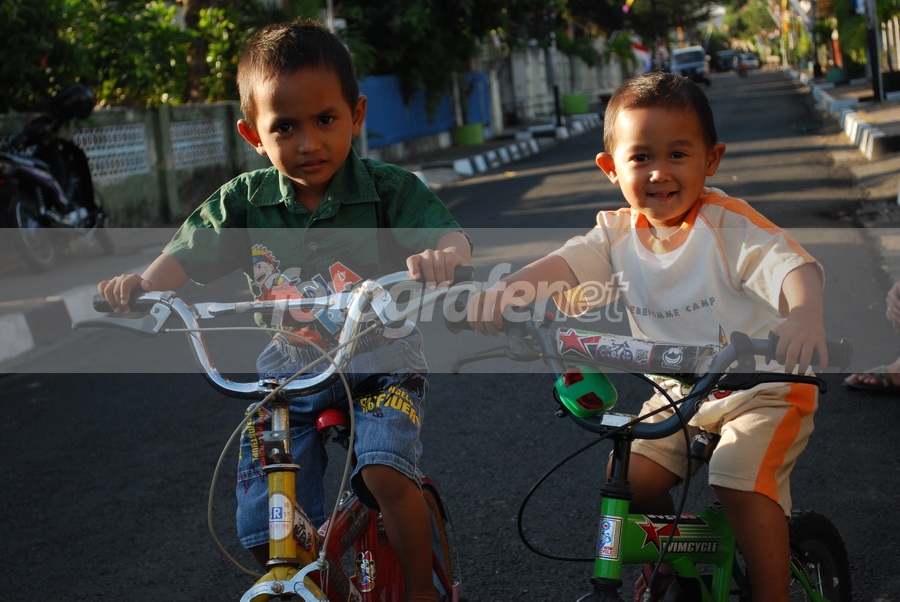 sore hari setelah mandi si kecil bermain dengan sepedanya