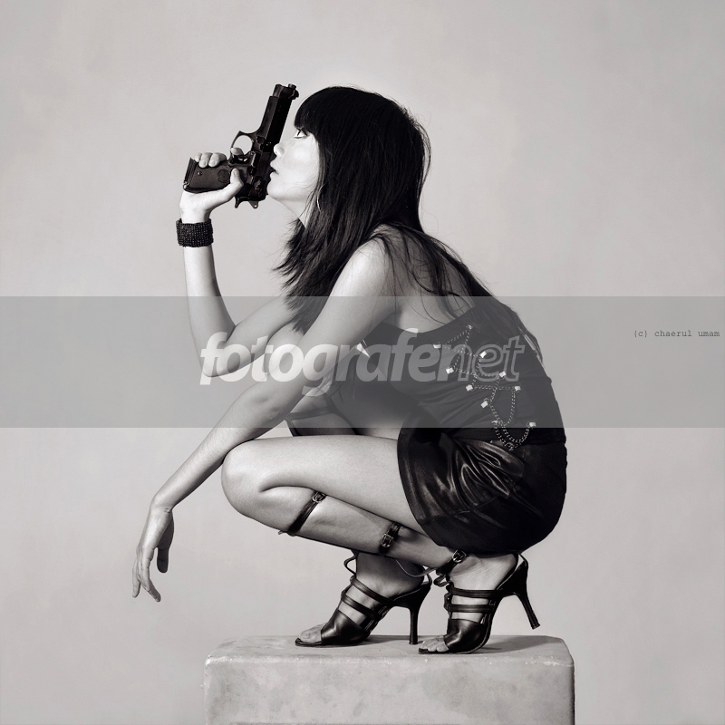 Tonalnya dan posenya keren...seharusnya jari si model tidak menarik pelatuk, krn bukan dlm posisi menembak, kan hanya pose saja....imho