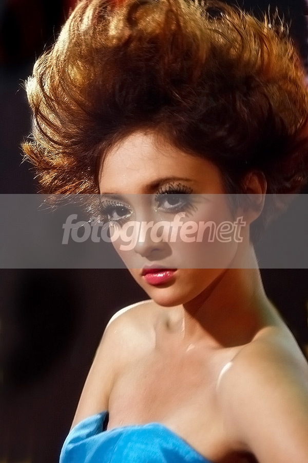 Amanda, sang model dengan tata rambut sasak dengan tatapan tajamnya. nDifoto dari acara fashion show di Bandung , hasil agak blur karena cahaya yg minim dan kamera hand held.