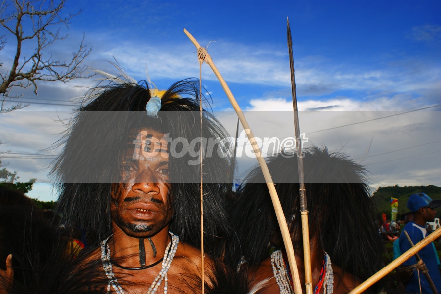 Busana tradisional pejuang mambramo raya yang ditampilkan dalam ajang FDS (Festival Danau Sentani) IV.