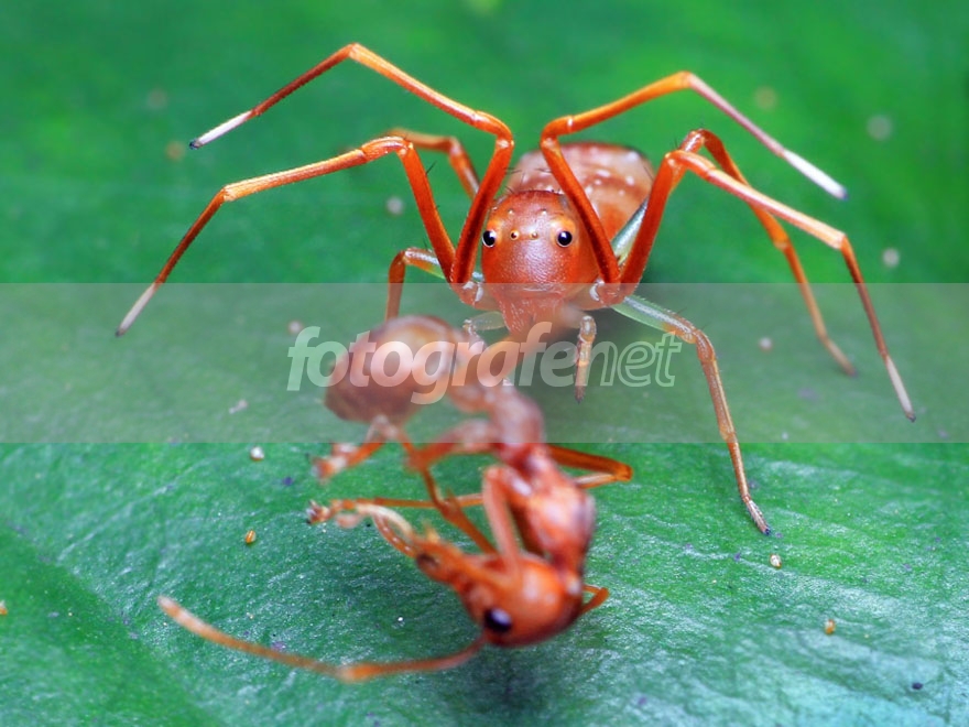 ini kayaknya jenis mimikri yang meniru sang mangsa, biasanya ga cuma bentuk & warna tapi jg feromonnya semut ikut ditiru om.. samoga info saya Salah, soale sotoy sithik.. :D TOP BGT MOMENT MACROnya..