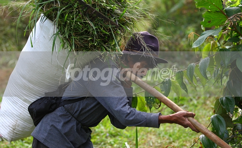 seorang pengumpul rumput untuk makanan kuda di sekitar cikole, menyiapkan hasilnya untuk diangkut ke tempat pengumpul yang berada dipinggir jalan.
