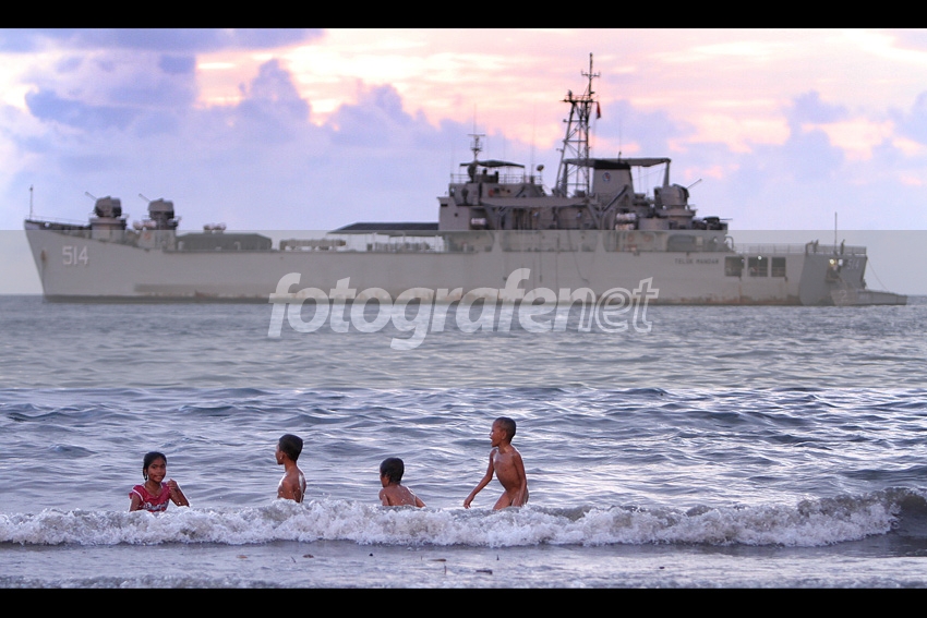 JELANG PACIFIC PARTNERSHIP - Anak-anak bermain dekat sebuah KRI TNI-AL yang sedang berlabuh di sekitar perairan Teluk Manado, Selasa (29/5/2012). Sejumlah kapal perang mulai berdatangan ke Teluk Manado untuk mengamankan kegiatan Pacific Partnership yang akan digelar hingga 15 Juni mendatang.