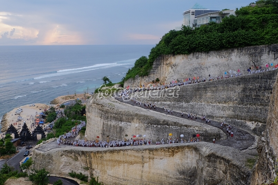 Prosesi mepeed usai melasti di pantai melasti. Orang-orang yang berjalan pada jalan yang berkelok membuat pemandangan menjadi menarik.