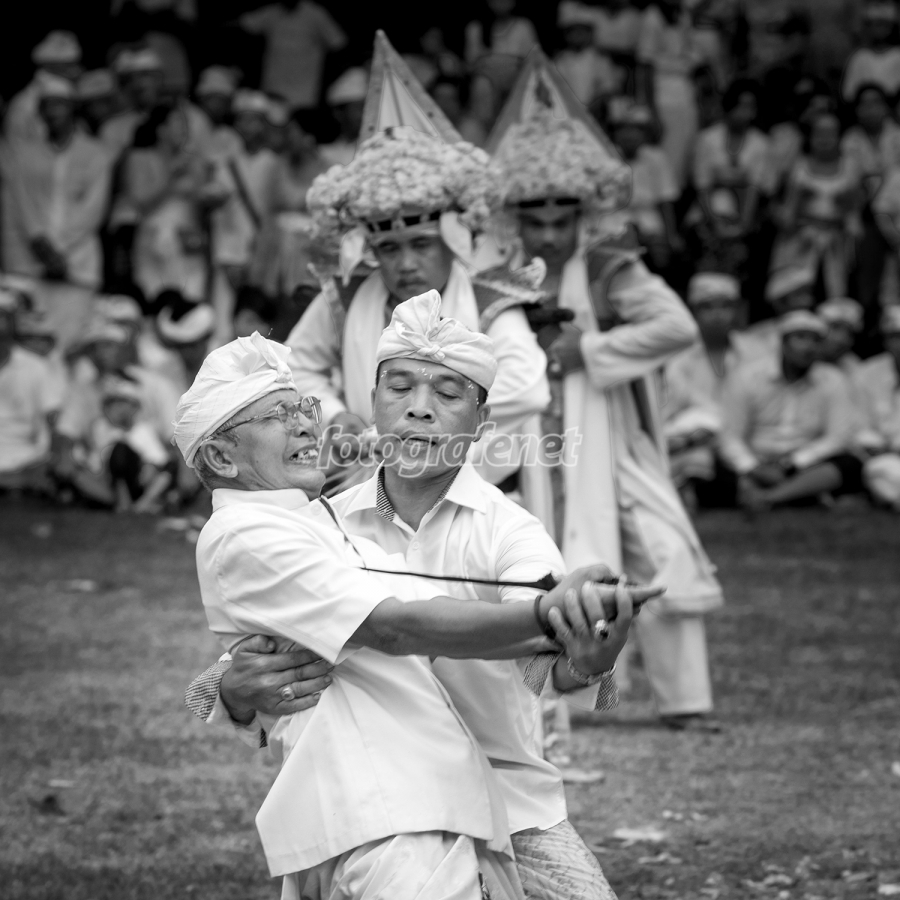 Dalam keadaan kerauhan, kerasukan dalam bahasa Bali, seseorang bisa melakukan banyak hal. Salah satu yang dilakukan bisa jadi menusukkan keris ke tubuh, sambil menekan dan memutar-mutar (ngurek) keris, tanpa tembus maupun terluka. Piodalan Tilem Kajeng Pura Dalem Kedewatan Sanur, Bali, Indonesia.