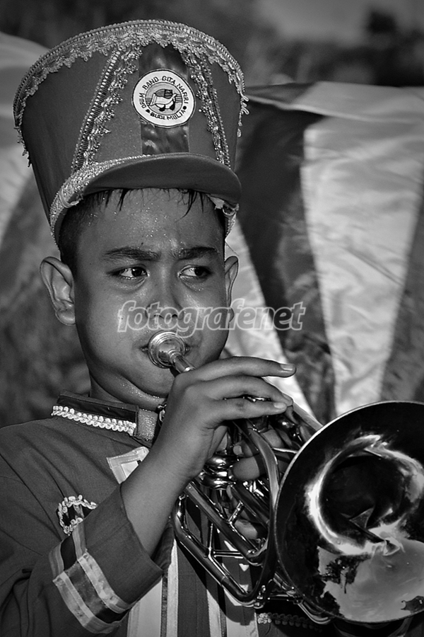 Ekspresi sebagai peniup terompet terekam dengan baik.