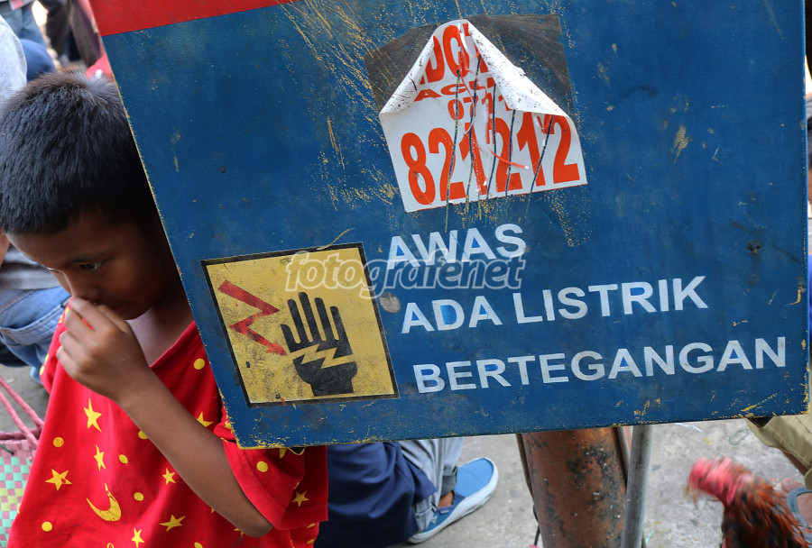 Seorang anak di samping gardu listrik.