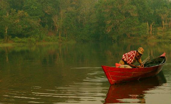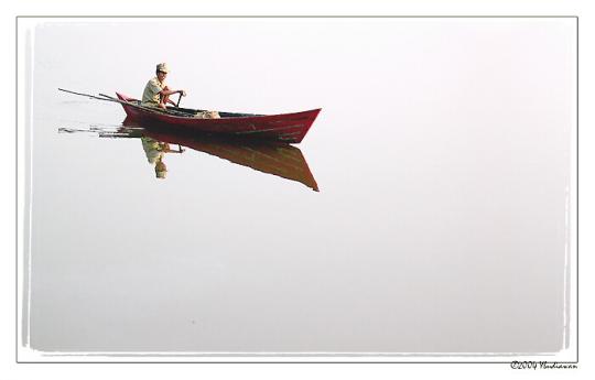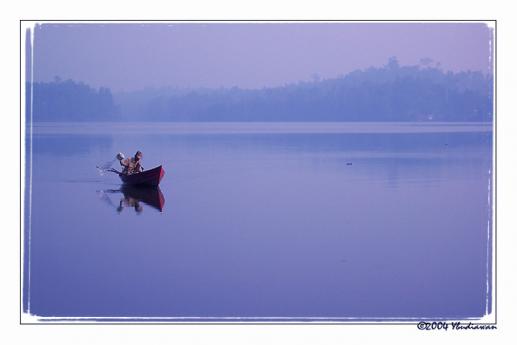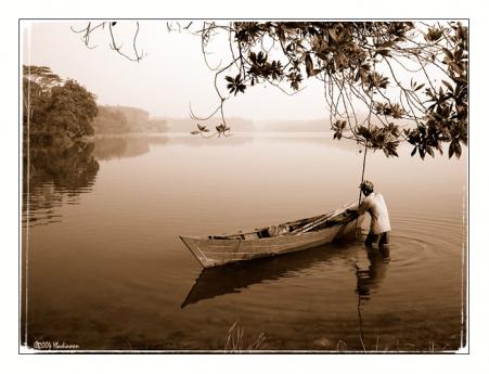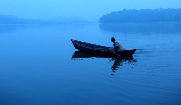 Fisherman, Canoe, and Blue Lake