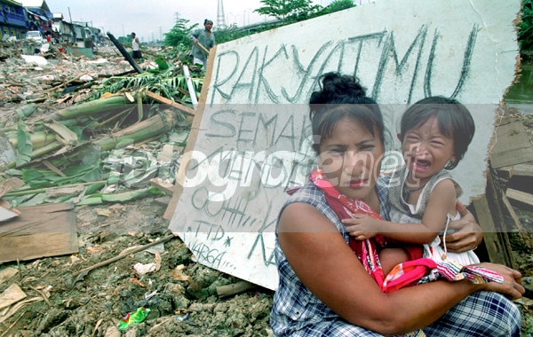 Seorang ibu bersama anaknya penghuni lokalisasi Kalijodo hanya dapat duduk terpaku setelah tempat tinggalnya habis digusur aparat