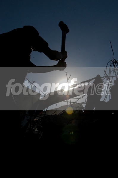 Seorang pemulung sedang membongkar sisa bangunan Pasar Wonokromo Surabaya untuk mendapatkan besi-besi tua yang dapat dijual lagi. Foto ini gak jadi dimuat di koran, makanya diupload ke sini aja deh...