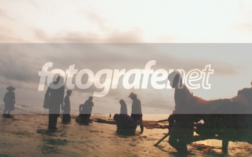 para nelayan/penduduk desa mencari ikan hias di pantai drini pada sore hari