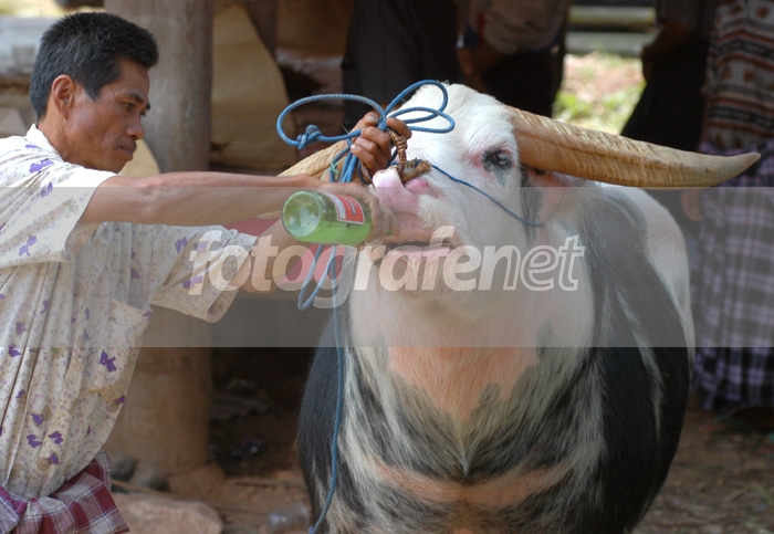 Entah suatu kebiasaan atau kebetulan pada suatu perayaan saja, kerbau balar (bule) Toraja, diberi minum bir. Setelah itu, penjaganya ikut minum.