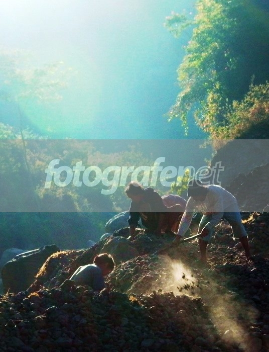 Pengumpul batu di dasar Kali Boyong. Dipotret menentang matahari, tidak frontal tapi agak miring.