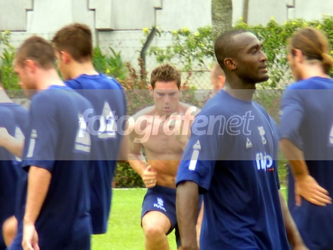 Pemain Birmingham City, David Dunn (tengah tanpa baju), sedang melakukan latihan intensif di antara rekan-rekannya dalam rangka persiapan FA Premier League Asia Cup di Kuala Lumpur, Malaysia, 24-27 Juli 2003 lalu.