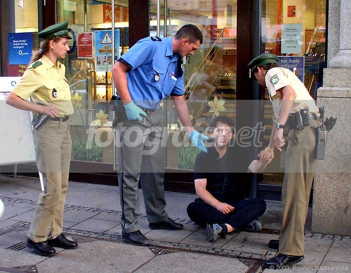 Seorang pemabuk berurusan dengan Polisi karena 'ngemper' di depan toko. Di Muenchen banyak dijumpai pemabok yang menggelandang di pinggir jalan. rnKalau diperhatikan, polisi wanita lagi pake celana jeans, polisi laki-laki di kanan pake anting2 :D