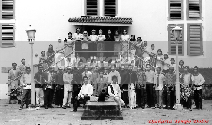 Sekumpulan anak SMA sedang bergaya di Museum Fatahilah dengan pakaian versinya masing-masing.