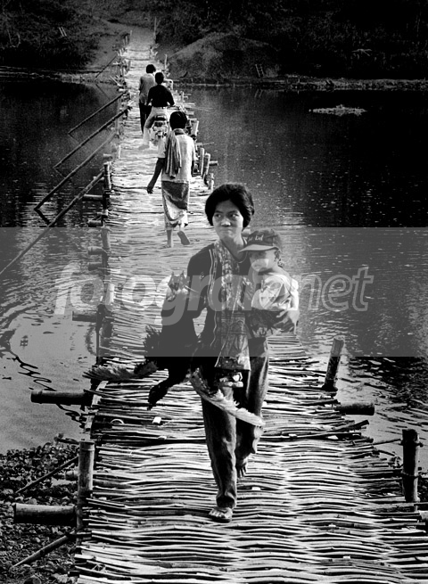 Suasana di jembatan bambu daerah Yogya,seorang ibu sambil menggendong anaknya,menenteng bebek ditangan kanannya.Scan dari foto agak kontras,asli BW