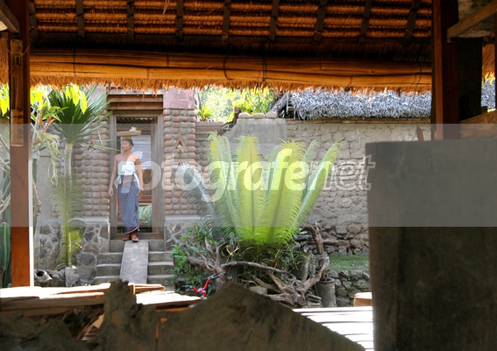 Seorang wanita Bali, menuruni tangga membawa sajen ke tempat upacara. Posisi saya di sebuah bangunan terbuka. yang digunakan sebagai tempat penyimpanan gamelan.