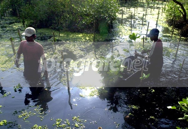 Dua pekerja menanam pohon bakau dalam rangka penghijauan hutan bakau Jakarta