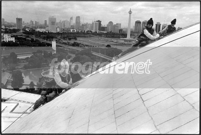 Sekelompok aktivis, membersihkan kubah Masjid Istiqlal menjelang Ramadhan tahun 1997