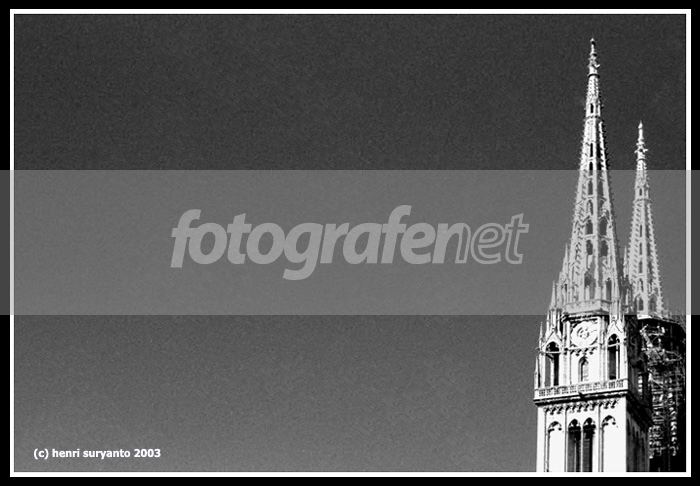 Menara katedral Zagreb. Katedral tersebut masih dalam renovasi, sehingga banyak tiang2 dan kayu yg cukup menganggu pemandangan. Diambil menaranya saja, karena hanya menaranya yg sudah tidak terlalu terganggu dengan renovasi. BW, level, contrast dg PS. Semoga berkenan.