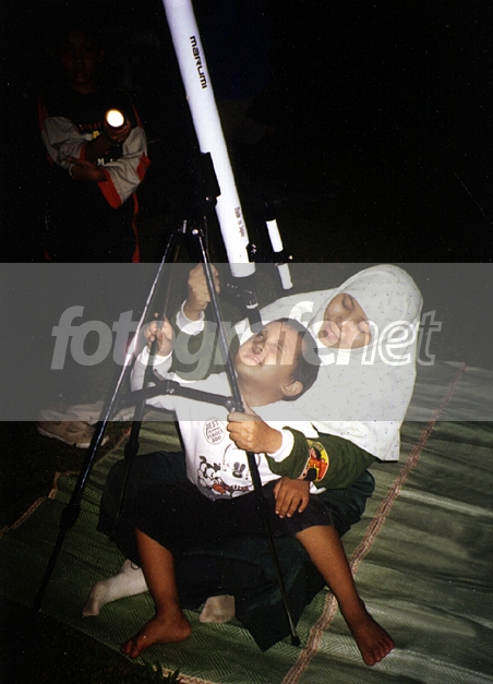 acara peneropongan di pondok baca arcamanik (bandung), oktober 2001.rnpondok baca arcamanik (pba) adalah perpustakaan umum untuk anak-anak, yang dimotori dan disupport oleh warga. pba ini bertujuan untuk memberi tempat bermain dan mencari ilmu lewat bacaan bagi anak-anak yang kurang mampu di daerah tsb dan sekitarnya. bulan oktober 2001, pba mengambil tema 'astronomi dan ruang angkasa'. salah satu acaranya adalah peneropongan langit malam, bekerja sama dengan himpunan astronomi amatir bandung (haab).rnrnfoto diambil dengan kamera pocket. sayang data film nggak ada lagi, maklum koleksi lama.rn