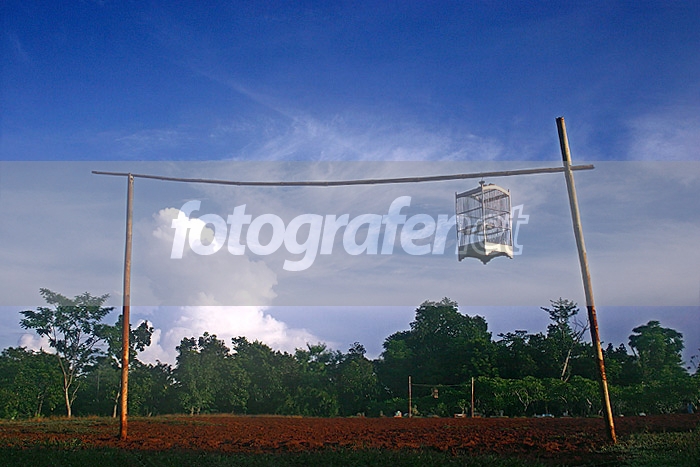 seseorang yang tinggal di samping lapangan sepak bola kampung menjemur beberapa kurungan burung di tiang gawang dari bambu pada pagi hari. di gawang yang ujung tampak juga samar2 kurungan burung yang sedang digantung.rnrnDate Time Original: 2004:01:06 06:36:30rnISO Speed Ratings: 100