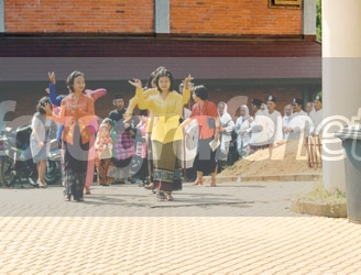Serombongan penari mengiringi sebuah prosesi.