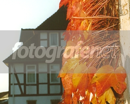 musim gugur, ttg daun hampir gugur yg menempel di dinding...dg latar belakang rumah-rumah khas pedesaan Jerman...(foto utuh; tanpa tempelan)