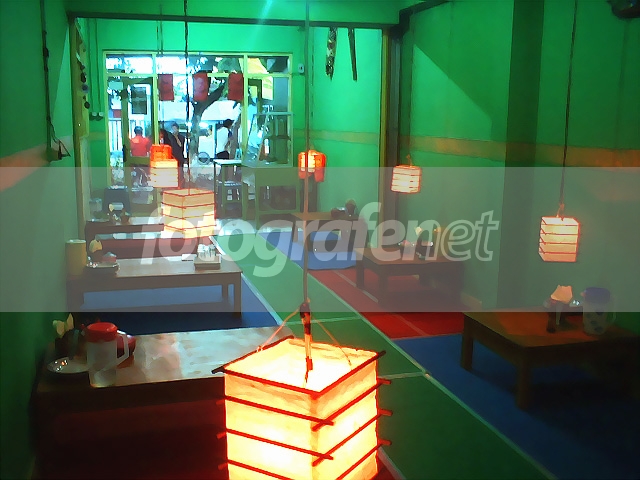 Aku suka makan disana. Kalau lagi laper, ngaso disana dulu. Pas lagi sepi, aku ambil gambarnya. Aku suka lampu-lampu lampion nya... dan warna warni karpetnya. Ruangannya rada gelap, tapi aku nggak pake Blitz. Jadi fotonya rada gelap.