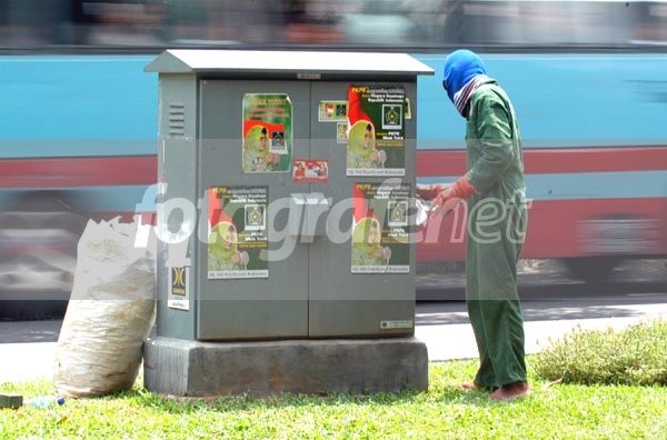 pekerja membersihkan poster-poster sisa kampanye