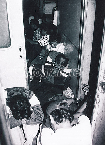 Penumpang kelas bisnis KA Senja Utama, Jakarta - Yogya, Maret 2004.rnrnNotes: Ga bisa tidur krn dapet \"jatah\" di sela2 gerbong, akhirnya menyalurkan emosi dengan memotret rekan2 senasib :)rnrnPS:rnMengenai kerasnya cahaya pd bagian depan: karena flashku ga bisa diputer scr horizontal, sementara utk dapetin angle ini hrs pake acara jinjit dikit :). Alternatif lain, kalo kamera agak diputer ke atas sedikit, konsekuensinya nanti org yg tidur di bag.depan hanya kliatan kepala/topinya & bagian atas foto akan terdapat banyak bagian kosong.rnSbenernya saya pengennya deretan kursi & penumpang bagian blakang jg harusnya dapet cukup cahaya. Tapi ya itu tadi mas, flashnya.. maklum, cap biskuit *Roma* ;)