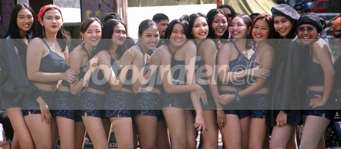 harusnya di-take satu per satu... beberapa punya potensi nih... hitungan dari kiri : paling kiri kakinya ceking amat... kontras ama yang gede di sebelahnya...:) yang ke-5... bagusnya gak usah senyum deh...:)) yang ke-8.... tatonya keris yach? yang ke-13.... emang lagi sial.... koq cuma kebagian kacamatanya doang...:)