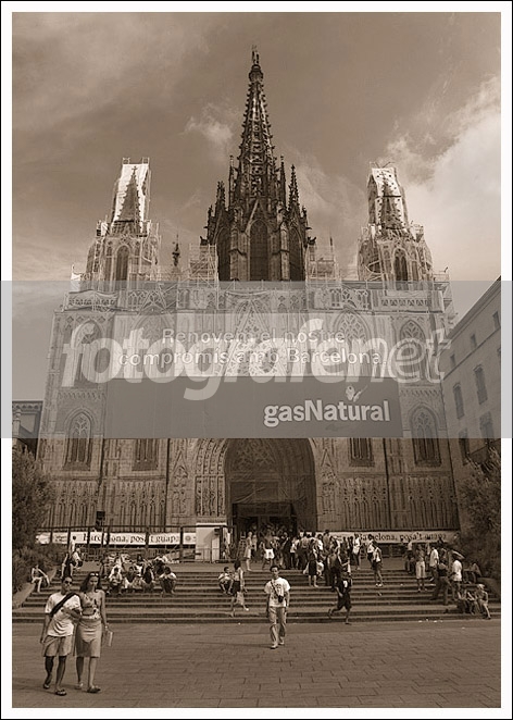 Date Time Original: 2004:08:17 17:18:50rnISO Speed Ratings: 100Katedral di wilayah Barri Gotic yang sedang mengalami renovasi, jadi yang kelihatan dari luar hanya menara utamanya aja, selebihnya ditutup pakai kain dengan gambar dan skala aslinya. Wilayah ini dipercaya merupakan cikal bakal kota Barcelona, bahkan di belakang katedral ini masih dapat disaksikan dinding dan kota yang dibangun jaman Romawi sekitar 2000 tahun yang lalu.Focal length 17mm, WB Sunny, PS untuk rubah ke sephia. Mohon kripiknya yang membangun. Makasih :)