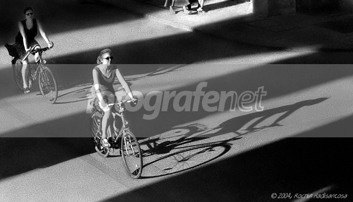 BW yang keren, bayangan orang bersepeda dan pilar (?) membuat foto ini jadi dramatis banget
