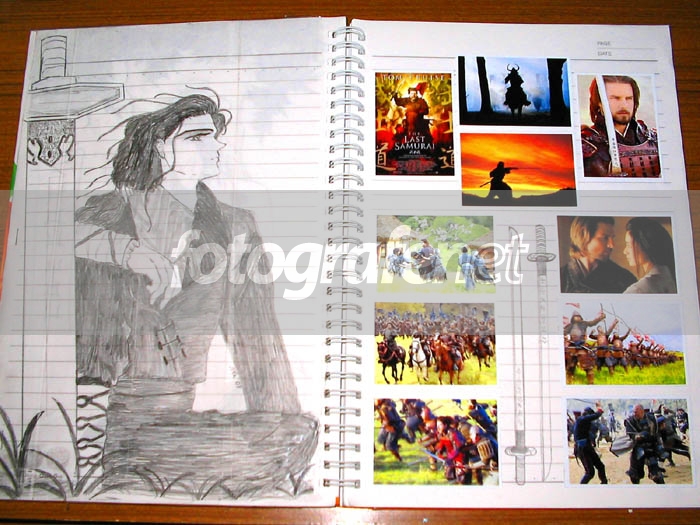 Cowok hitam putih itu, saya gambar dari komik Jepang, soalnya cakep dan macho sih..;). Terus sebelahnya foto - foto dari The Last Samurai. Ada Tom Cruise ! yang menyegarkan mata dan pikiran saya, karena dibalik halaman itu ada sederetan tugas dan job kuliah yang harus saya kerjakan..phew !. Walaupun secara teknis foto ini biasa aja, tapi saya senang bisa membagi sudut fave saya di agenda ini dengan anda.