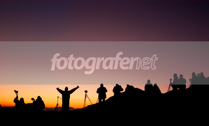 Para fotografer menikmati suasana menjelang matahari muncul di ufuk Timur.