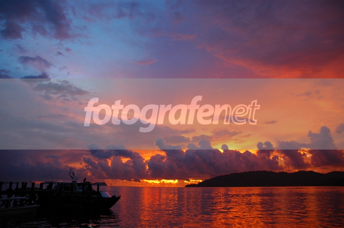 Warna senja yang dramatis, perahu kiri silhouette agak gelap.overall bagus.