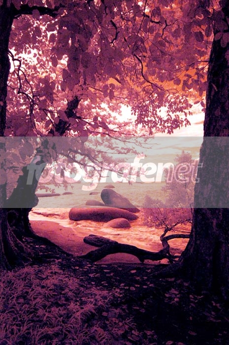 He he, penyajian pantai yang ga biasa nih.. motretnya sambil ngadem ya? Suka dengan idenya, dari gelap ke terang, batu-batu sebagai jembatan, pohon sebagai frame, dan nuansa purple IR... Top deh..