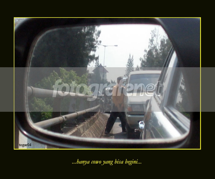 Date Time Original: 2004:11:10 08:33:22rnFoto ini diambil tadi pagi di atas flyover Cawang, tol arah Grogol, ditengah kemacetan lalulintas. Pada saat itu kenderaan berhenti total 10 menit!! Sambil 'menikmati' macet taunya ada yang kebelet dan terlihat di kaca spion... buru-buru ambil kamera di tas sebelum 'moment'nya abis. Fotonya gak tajam sama sekali, cuma mau share aja sama FNers bahwa hal ini bisa terjadi diantara kita, yg di Jakarta, dan ... hanya cowo yang bisa begini... Hehehe...rnAku gak ngerti mau diapain di PS supaya fotonya lebih OK jadi aku cuma crop, auto level, auto color and contrast... masukan (atau cacian deh) dari rekan-rekan ditunggu. Foto ini tidak masuk dalam kategori terbatas karena sang model sudah menutupi diri dengan kedua tangannya.
