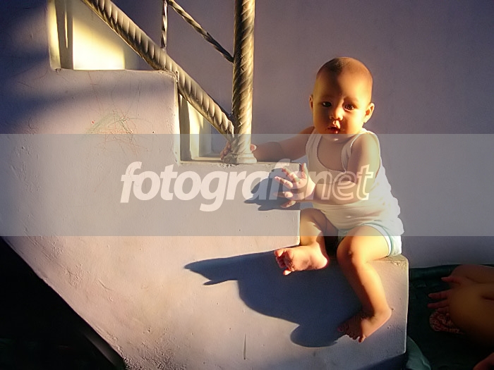 Fotonya cukup bagus adanya. Side lighting nya bagus namun perlu sedikit cermat dalam mengontrol pencahayaan. Terutama jika obyek adalah bayi seperti ini. Akan lebih bagus bagi saya kalo perbedaan antara shadow dan highlightnya tidak terlalu jauh agar lighting yg ada dapat menghasilkan emotion light yg sedikit lembut yg cocok dengan karakter si bayinya :D. Gunakanlah reflector sebagai fill in di sisi kiri foto. Untuk format saya prefer dibuat vertical saja, di crop sisi kiri foto sebatas tiang teralis yg kecil agar lighting yg agak contrast pada dinding anak tangga atas tidak nampak karena menganggu konsentrasi mata ke obyek bayinya. Salam....