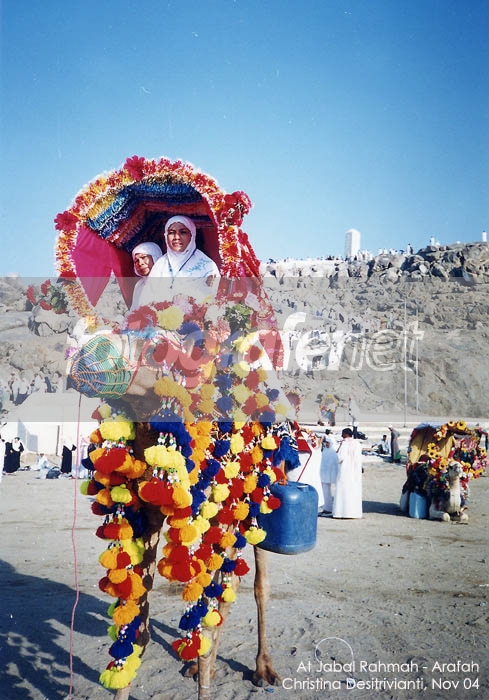 Ini lg di Jabal Rahmah. Yg lg naik onta, "temen seperjuangan" saya selama umroh. Disana, kita bisa foto sambil naik onta (mbayar dululah tentunya). Semua onta didandanin colorful kayak gini, suka deh liat warna warninya.... Difoto kalo nggak salah jam 12-an. Sengaja sy foto agak minggir sedikit biar keliatan tugu Jabal Rahmahnya di belakang.
