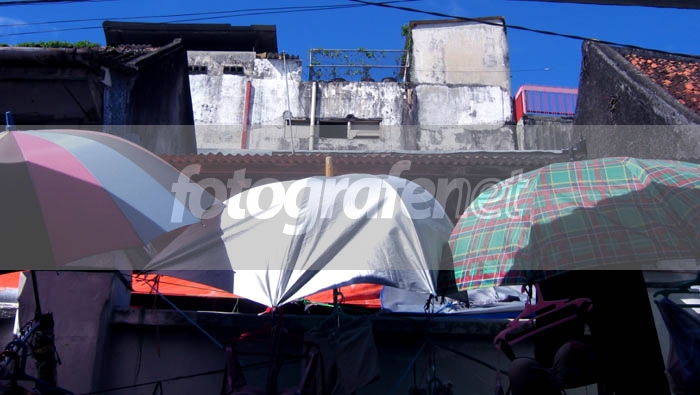 Tiga payung dan bangunan tua... lindungi kami dari teriknya mentari Jokeja...
