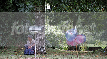 Seorang bapak tua penjaja balon yang sedang menunggu pembeli, Foto diambil di Kebun Raya Bogor