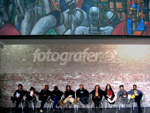 Wuihhh..., kerennn polanya. Lukisan di atas yang berpola besar, tembok bata yang berpola kecil-kecil, and voila ... subjek yang berbaris rapi jadi kelihatan menonjol secara visual. Sayang tuh Si Hitam duduk di bagian shadow tergelap - jadi aja mukanya hilang ditelah underexposure. Bagian highlight kanan tengah juga OE. Tapi secara keseluruhan, it's a great design. A picture that catches the eyes. Bravo!